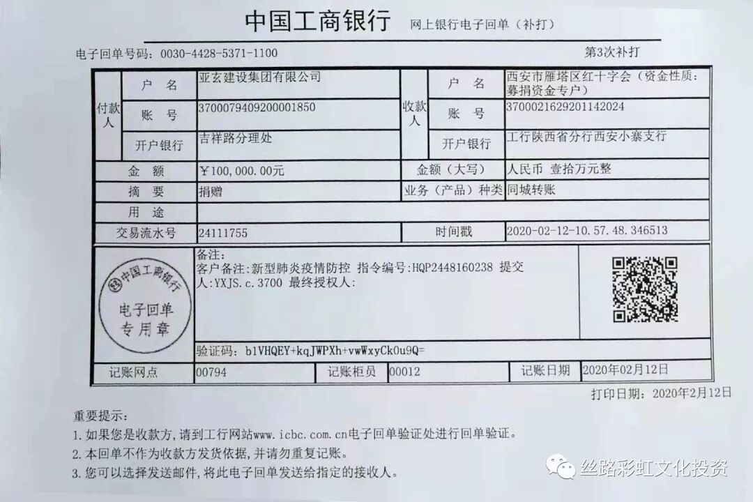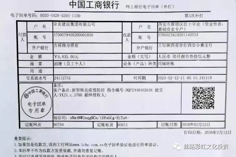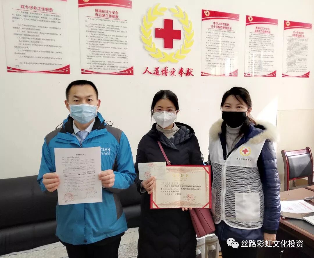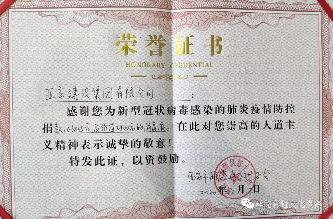 众志成城 抗击疫情 作为一个有社会责任感的民营企业,亚玄集团认真落实党和国家的相关政策部署,并于2020 年 2 月 12 日在集团内部组织了以“众志成城 抗击疫情”为主题的爱心募捐活动。 此次募捐活动,集团捐助爱心善款 10 万元,员工自发捐助6835 元,为战疫一线捐赠 50 斤装的 10 桶消毒液。董事长陈浩先生亦以个人名义通过农工党陕西省委相关部门捐助 2 万元,用于全国疫情防控工作。 丝路彩虹文化产业投资有限公司作为集团公司的一份子,积极响应集团号召,最大限度减少人员流动,最大限度保证员工身体健康,最大限度减少社会接触面,用实际行动表达自己对疫情防控工作的支持和对一线工作者的感谢,为共同抗击疫情并全力打好疫情防控阻击战贡献绵薄之力! 我们坚定信心,理性应对,不惊慌、不悲观,不畏疫情!在全国上下一心抗击疫情的重要时刻,丝路文投愿积极贡献自己的力量,助力战“疫”,共渡难关。